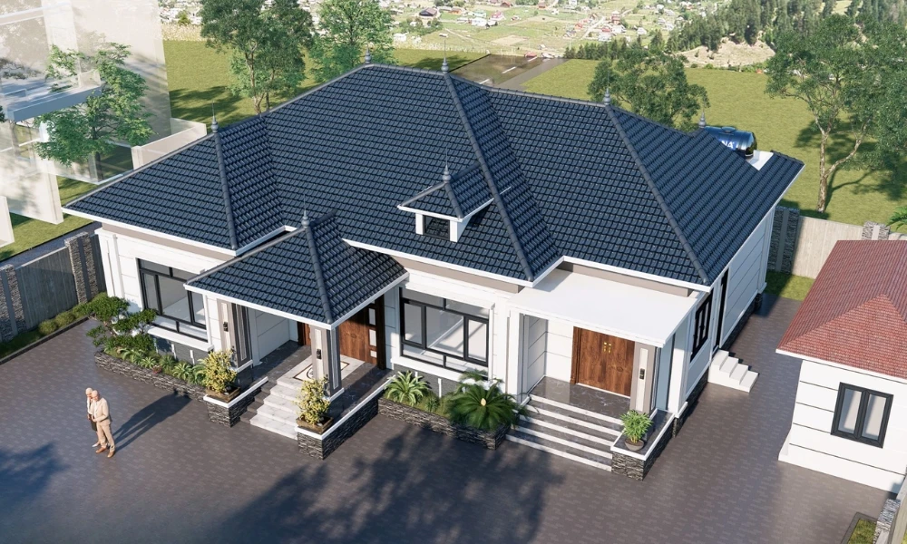 Ngôi nhà với lớp sơn màu trắng làm chủ đạo, kết hợp cùng hệ mái Nhật được thiết kế bằng những khung kèo thép nhẹ chắc chắn, những viên ngói bằng ngói romantisc bền màu, được rất nhiều gia chủ lựa chọn, những hệ mái san sát nhau cùng những ô chờ trên mái giúp phần mái được thông thoáng hơn. Các sảnh chính và sảnh phụ đều được thiết kế một hệ mái, giúp ngôi nhà thêm phần nguy nga và tráng lệ. Dưới diềm mái được sơn một lớp sơn màu xám kết hợp những hệ đèn, cửa sổ rộng rãi mở ra giúp những tia nắng tràn vào không gian bên trong.